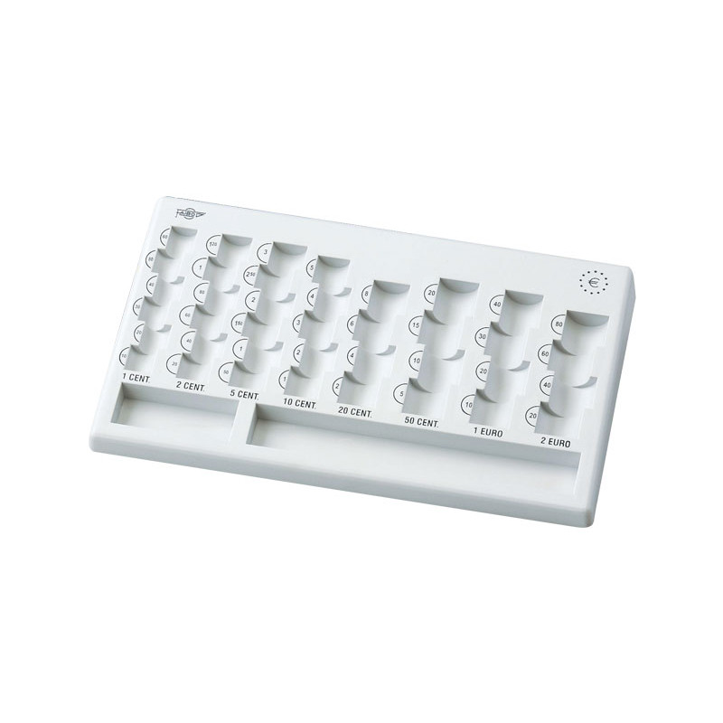 Bandeja para clasificar monedas de euros. Con ocho departamentos, uno por cada valor de moneda. Color azul. Dimensiones: 310x185x30mm.